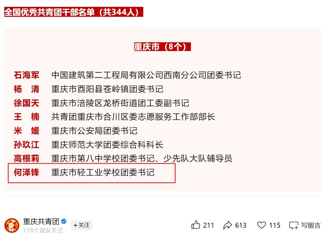 在本次表彰中,重庆市共有6个团委、9个团支部(团总支)、12名共青团员、8名团干部获此殊荣。我校团委书记何泽锋荣获全国优秀共青团干部称号,彰显了我校共青团工作的扎实成效与团干部的过硬素养。