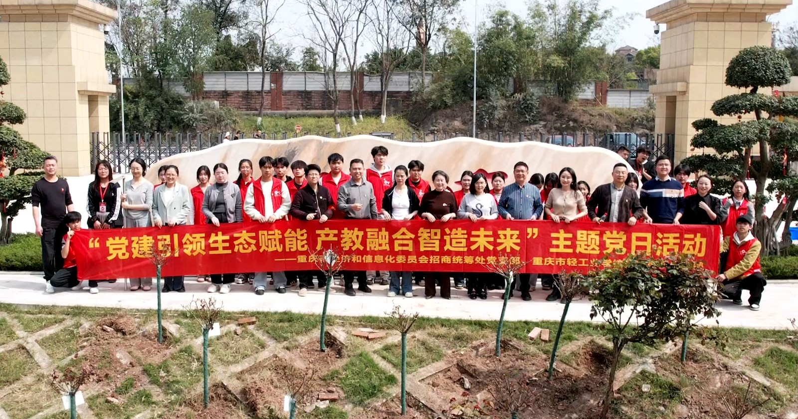 为深入践行习近平生态文明思想,充分发挥党建引领作用,推动招商引资与职业教育精准对接、深度融合,2026年3月12日第48个国际植树节下午,重庆市经济和信息化委员会招商统筹处党支部携手重庆市轻工业学校招生团委党支部,以“党建引领生态赋能 产教融合智造未来”为主题,在重庆市轻工业学校开展义务植树及调研交流活动,以实际行动绘就生态建设与人才培育融合发展的新图景。