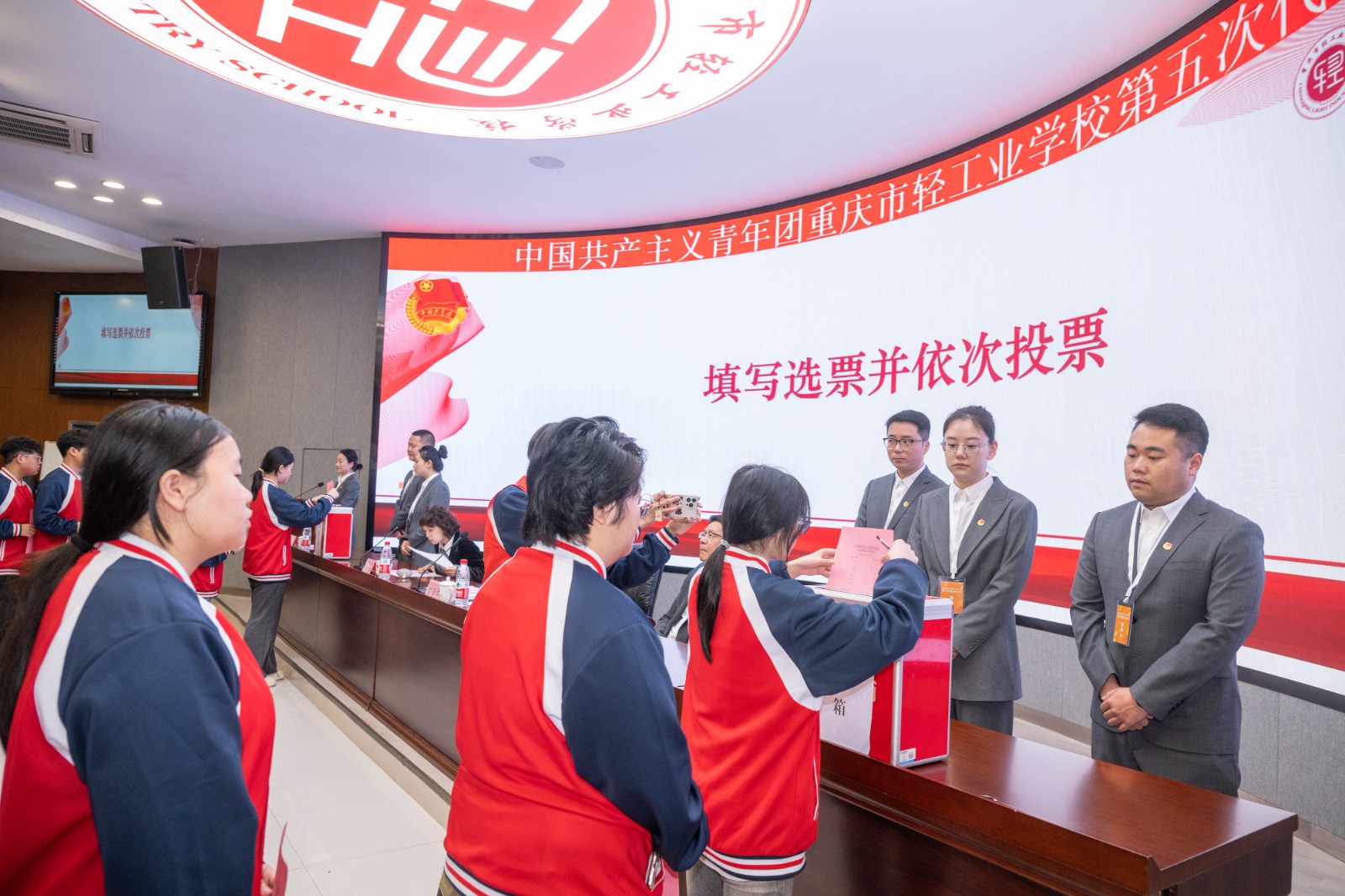 在充分了解候选人情况后,与会100名团员代表以高度的政治责任感,认真行使民主权利,通过无记名投票方式,差额选举产生了共青团重庆市轻工业学校第五届委员会委员。经选举,孙楷菱、刘亦君、邱怿纯、杨博涵、杜羚源、李雨阳、何泽锋、何睿、林欣雨9名同志当选为共青团重庆市轻工业学校第五届委员会委员。学校党委专职副书记吕正伟同志郑重宣布了当选委员名单。